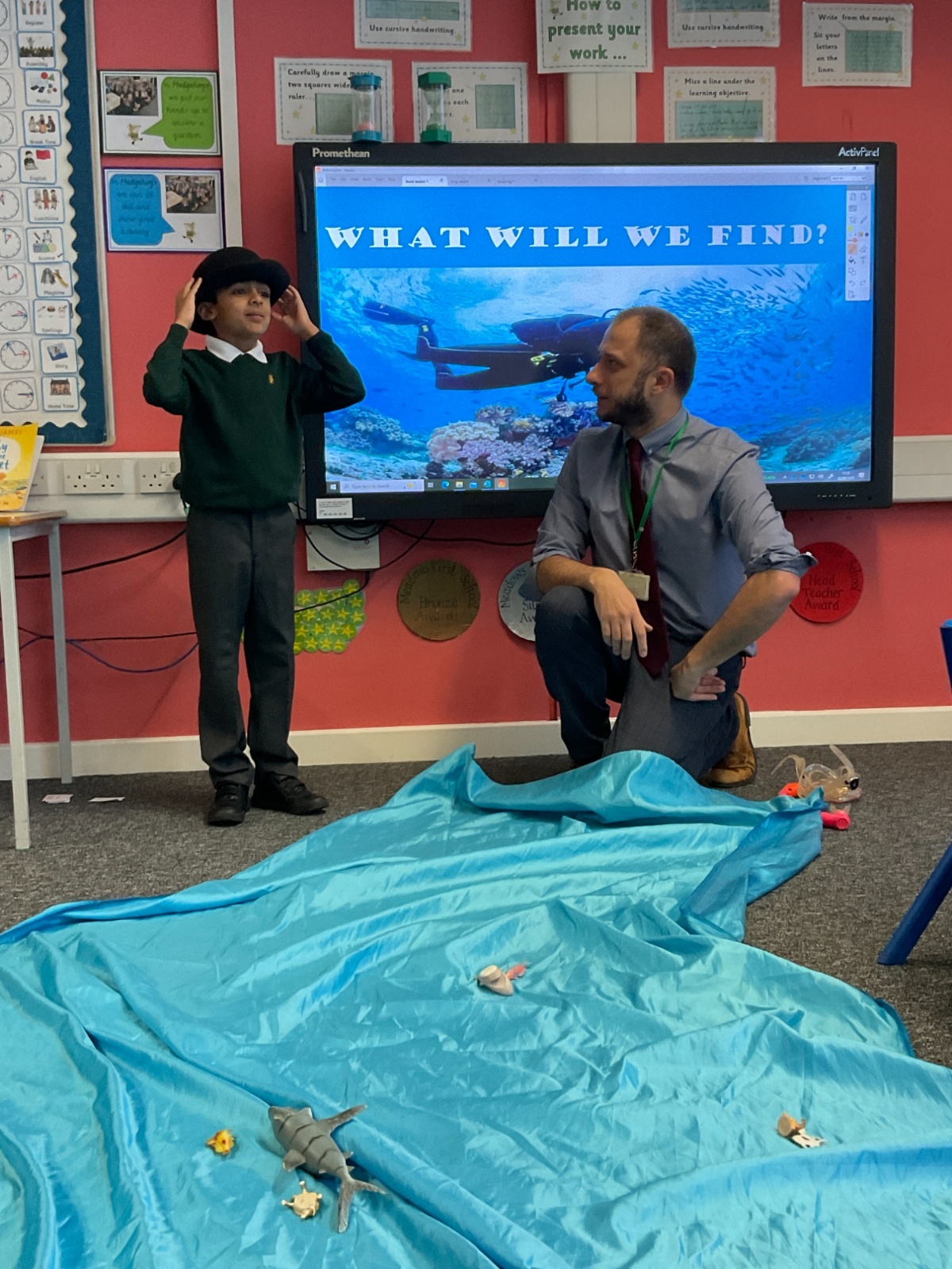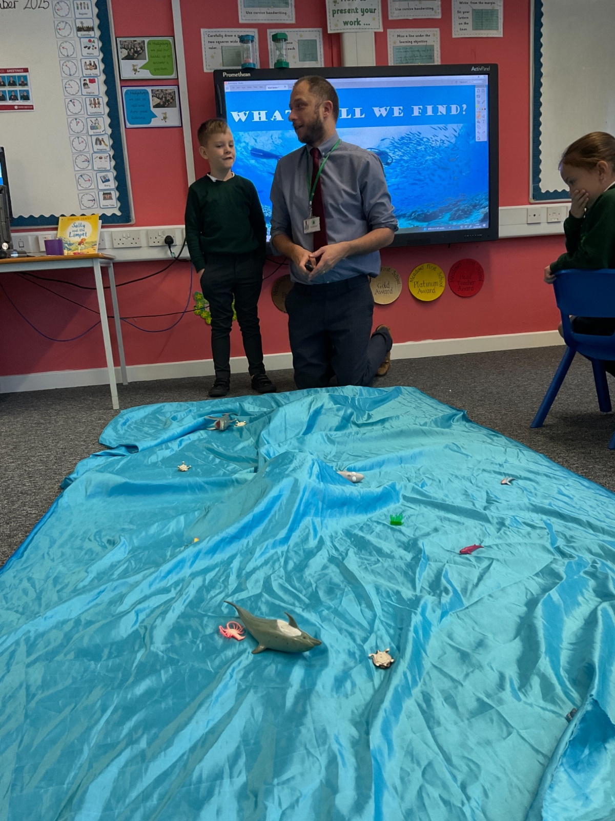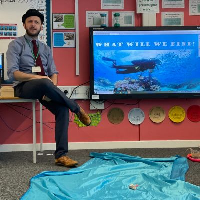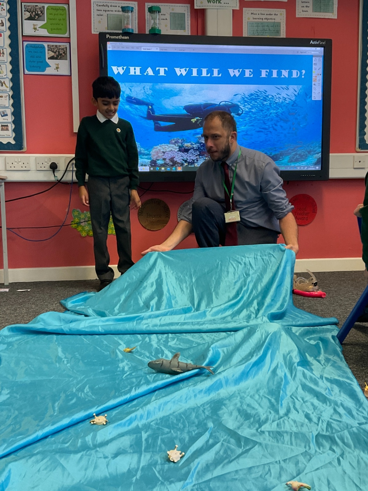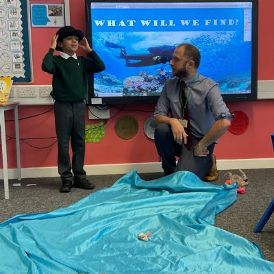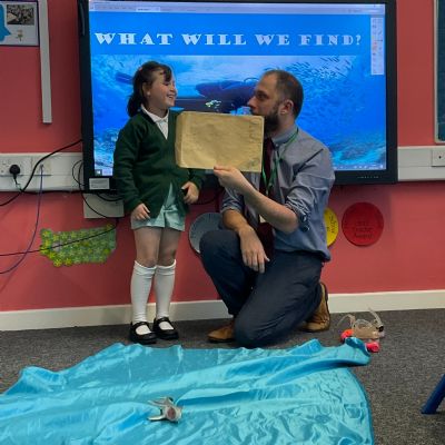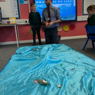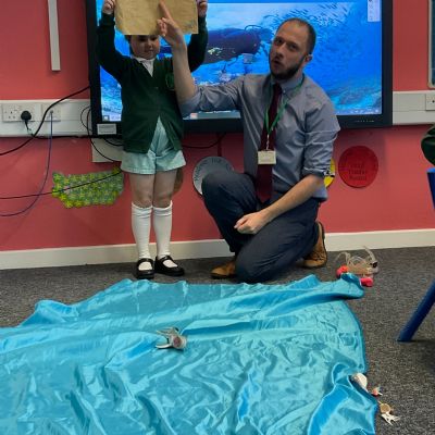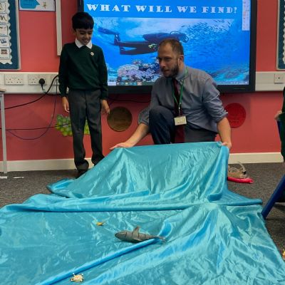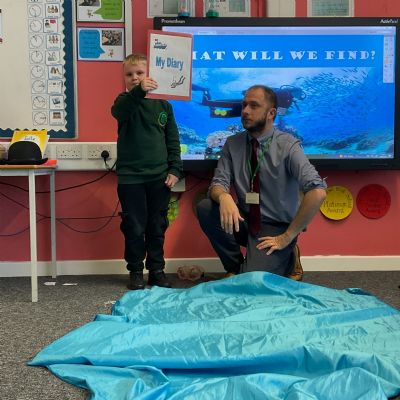 We arrived in our classroom after assembly to find someone had spilt an entire ocean on our carpet! We took it in turns to dive for clues to find out who it was!