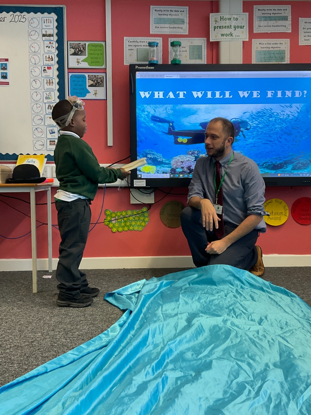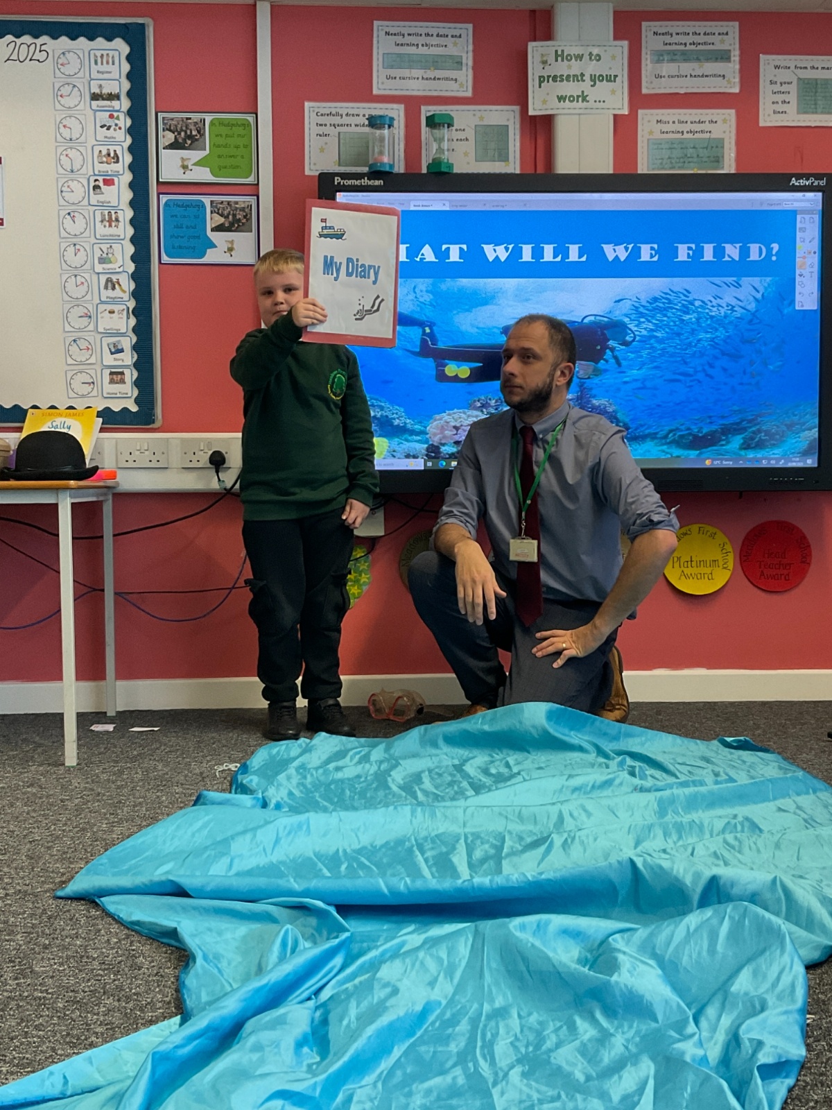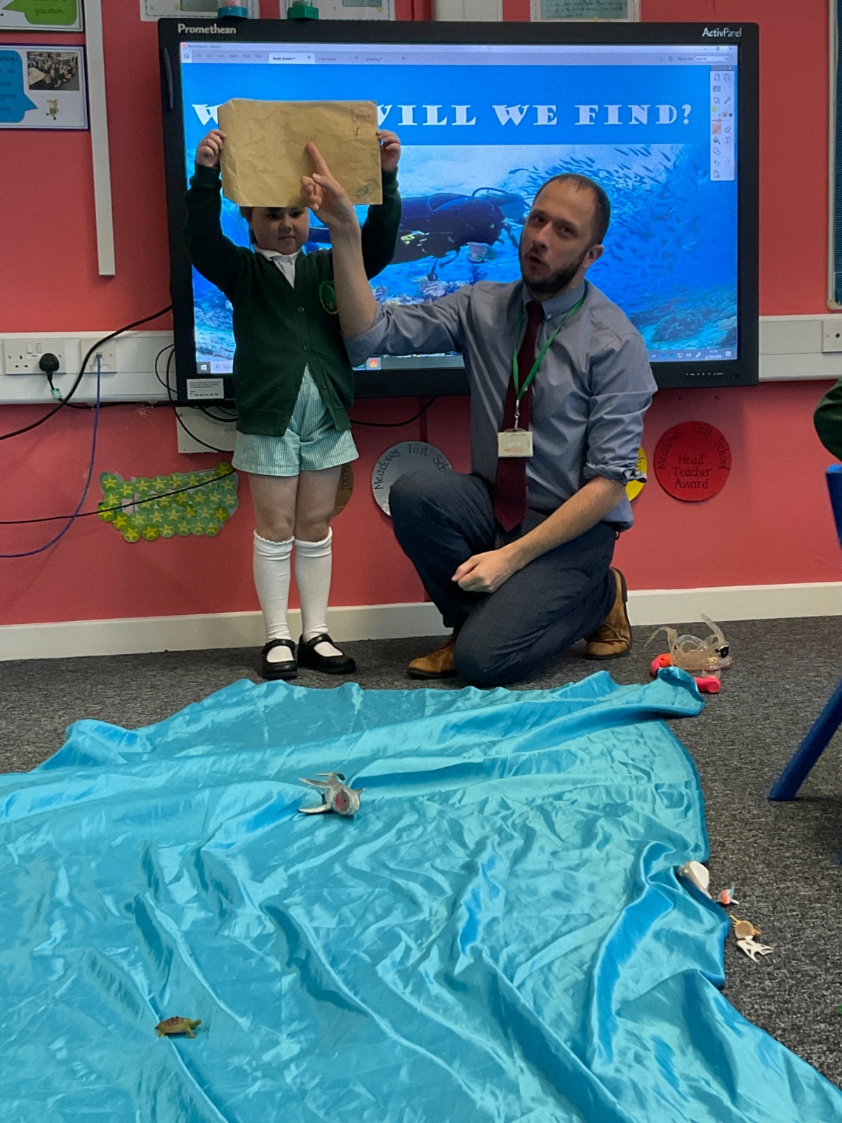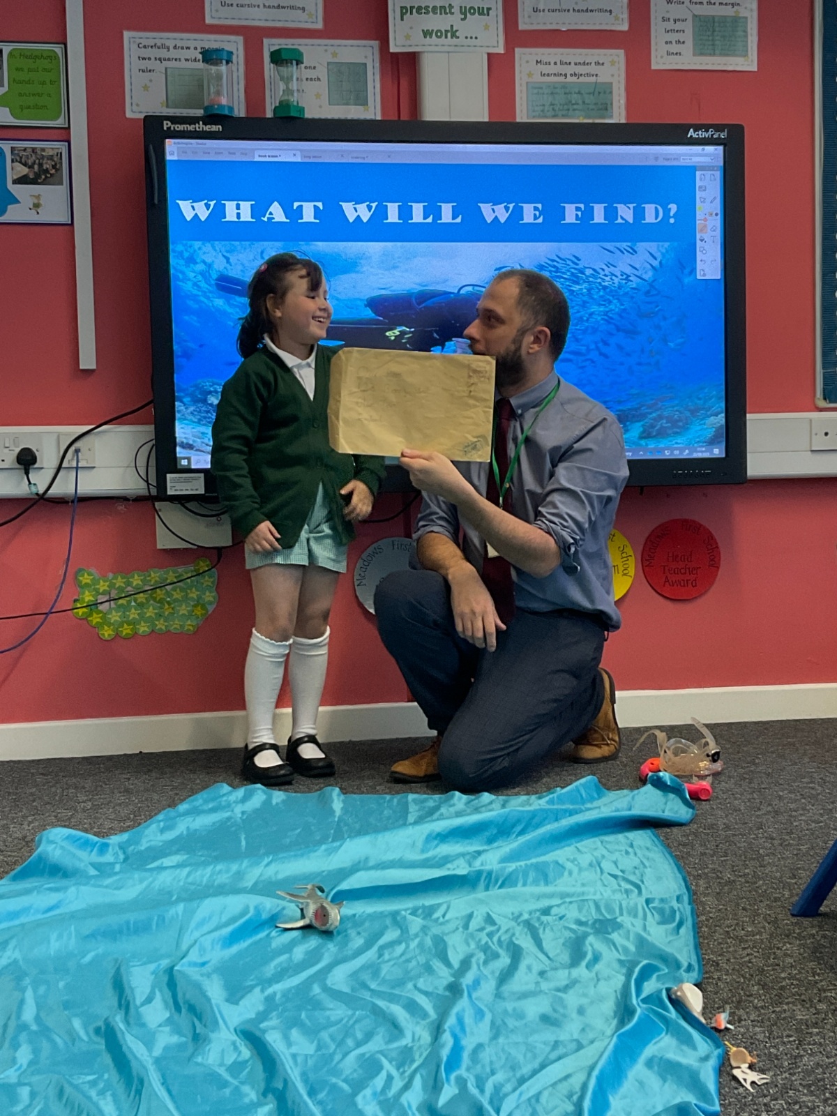 We arrived in our classroom after assembly to find someone had spilt an entire ocean on our carpet! We took it in turns to dive for clues to find out who it was!