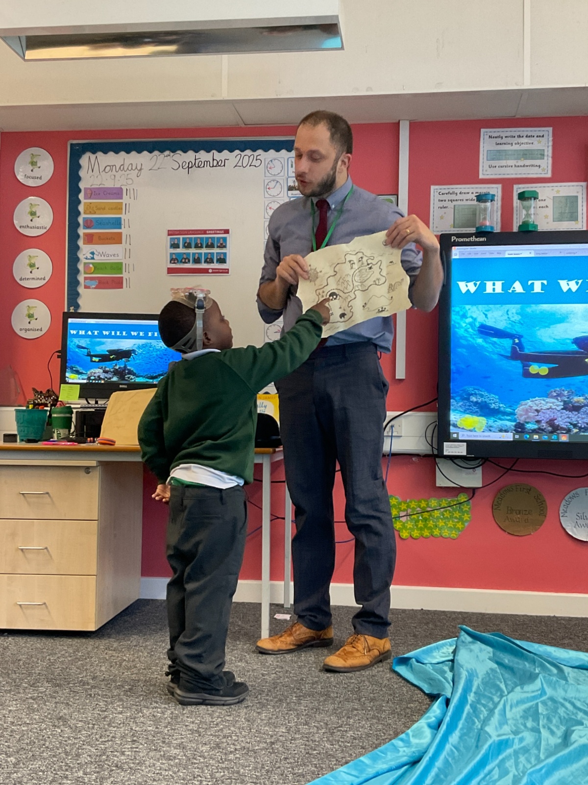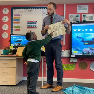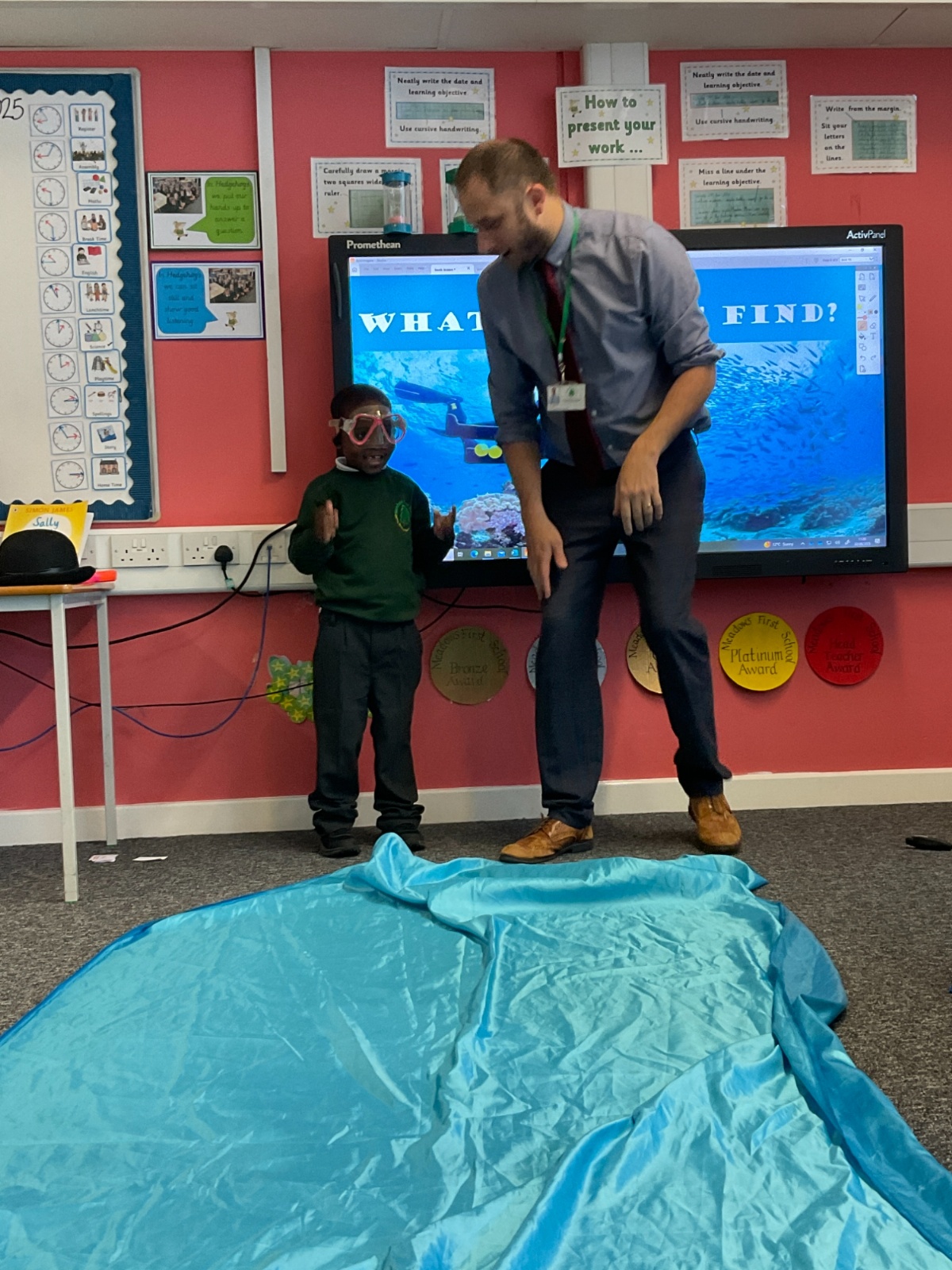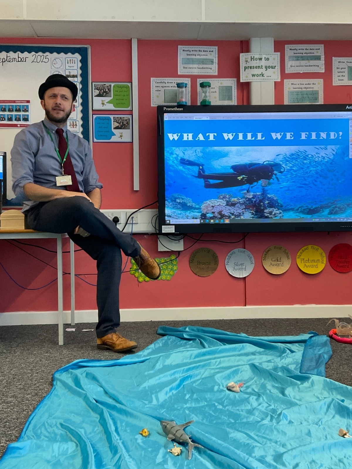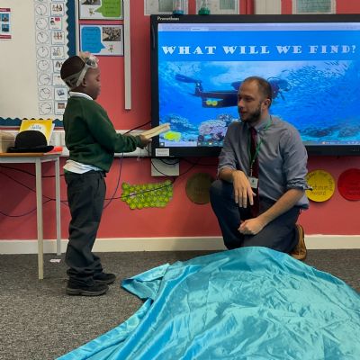 We arrived in our classroom after assembly to find someone had spilt an entire ocean on our carpet! We took it in turns to dive for clues to find out who it was!