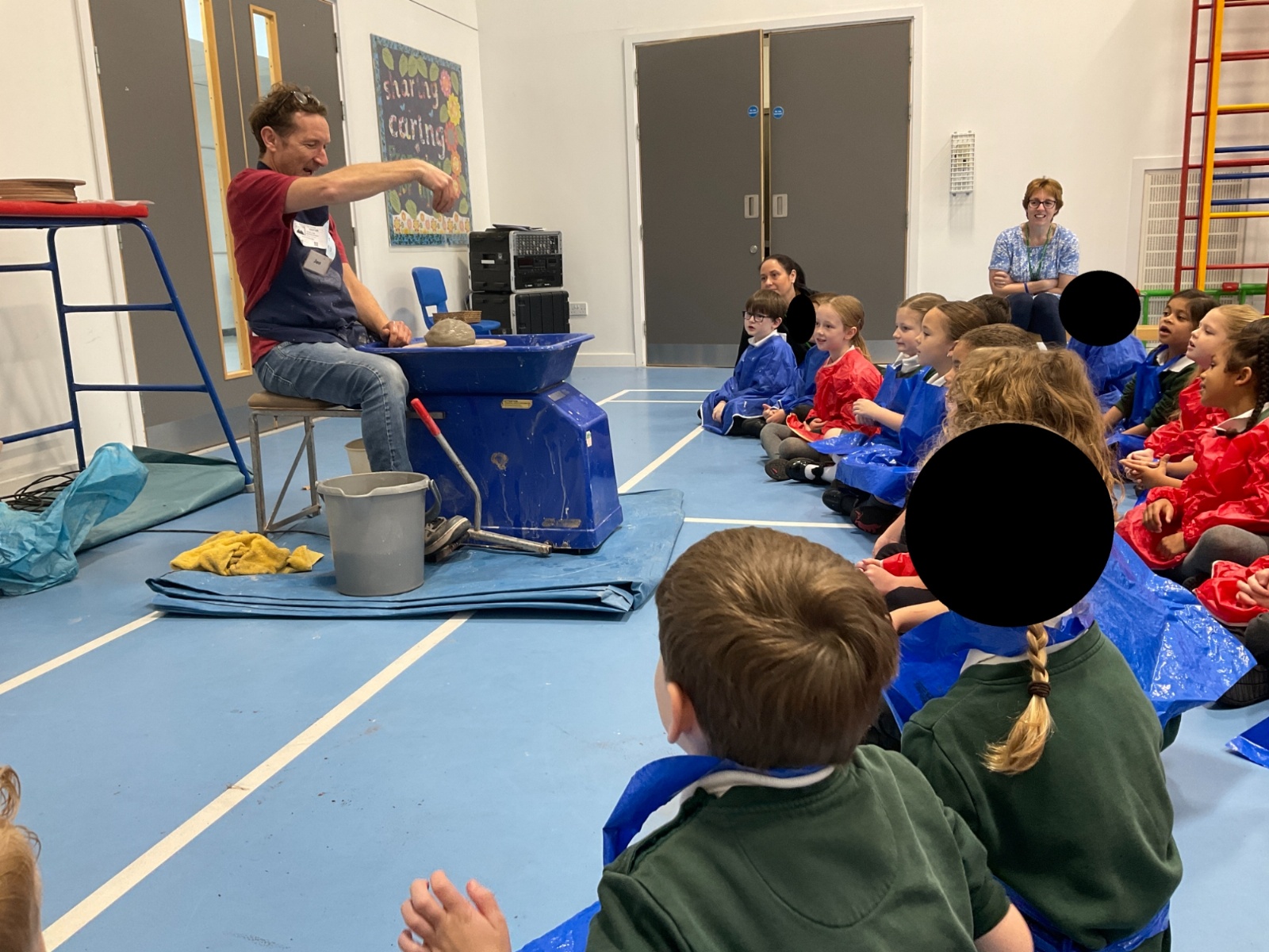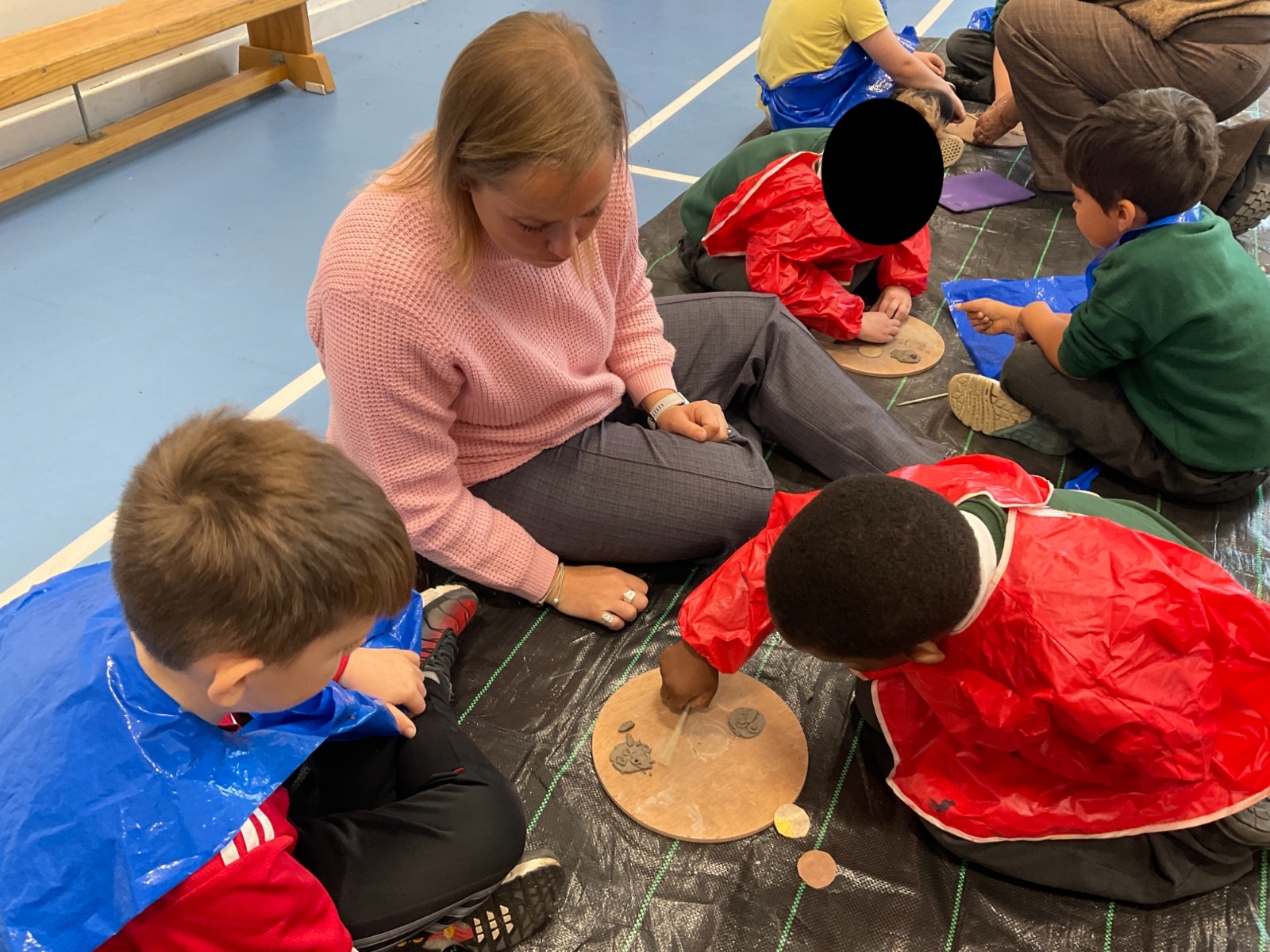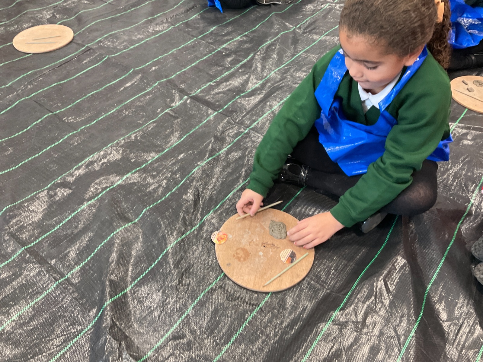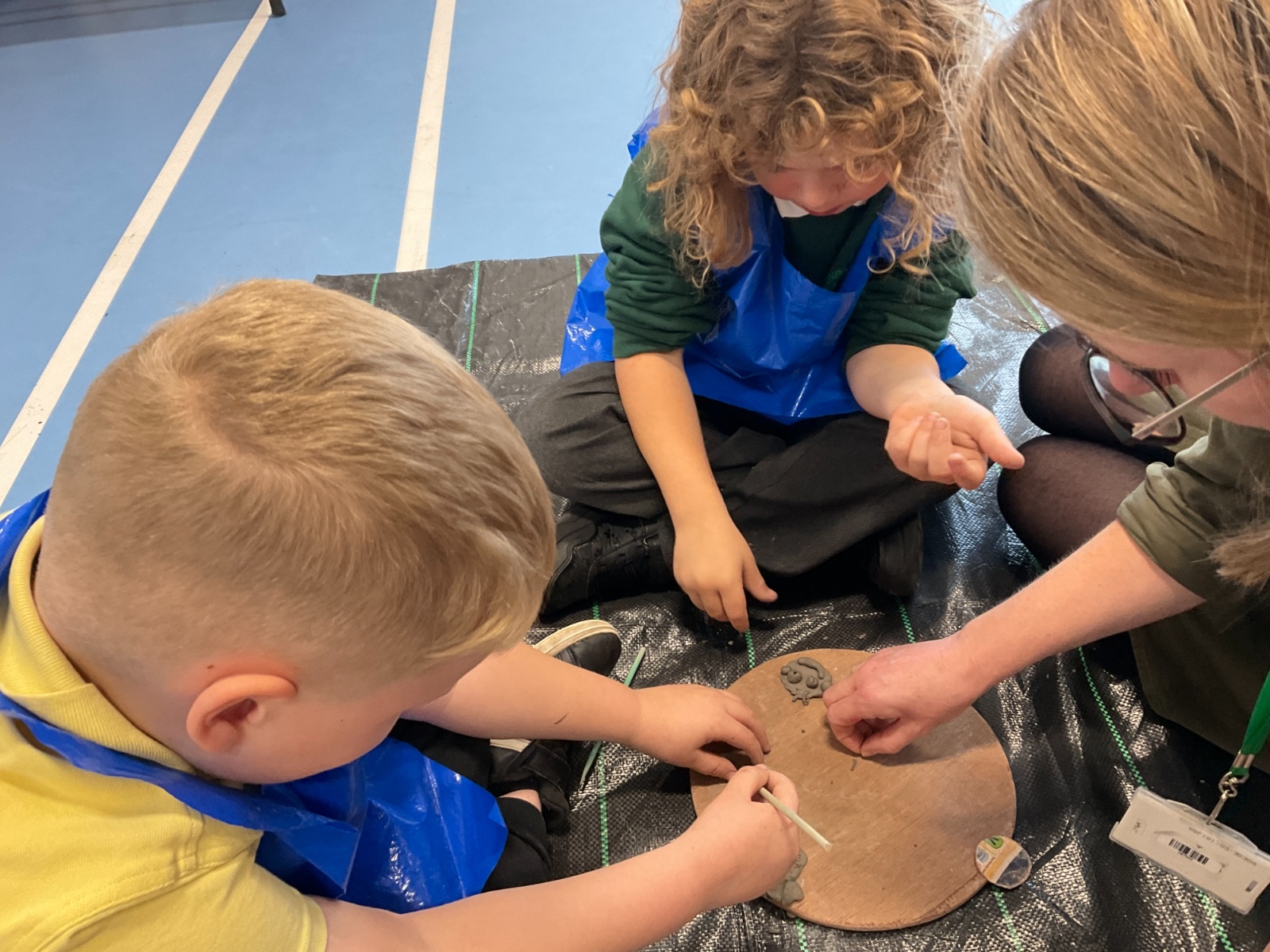 In Arts week we were visited by Jon the Potter. He helped us to make a class plate. We each had to create our own faces out of clay.